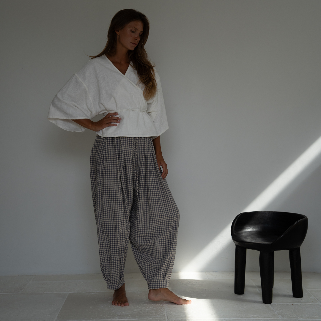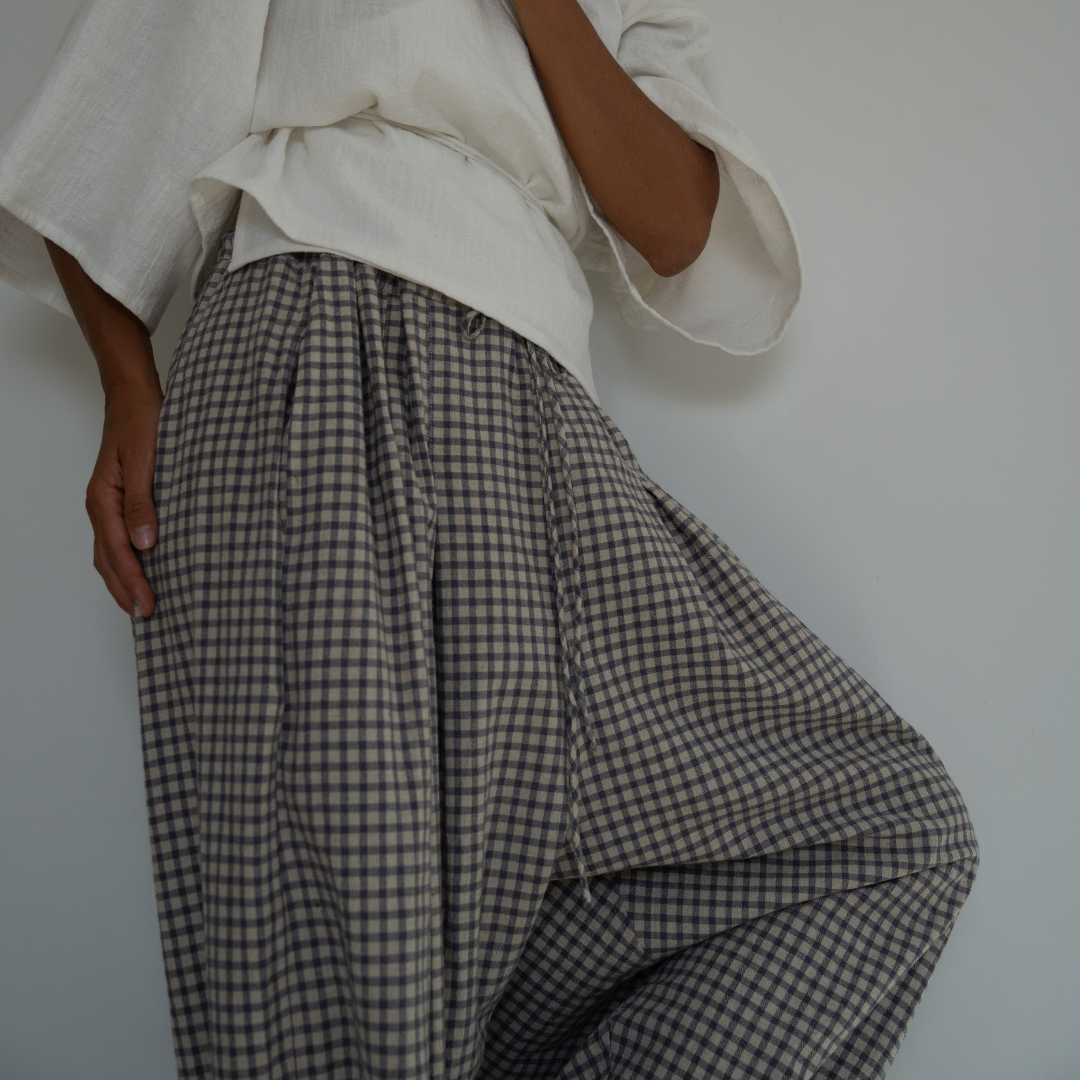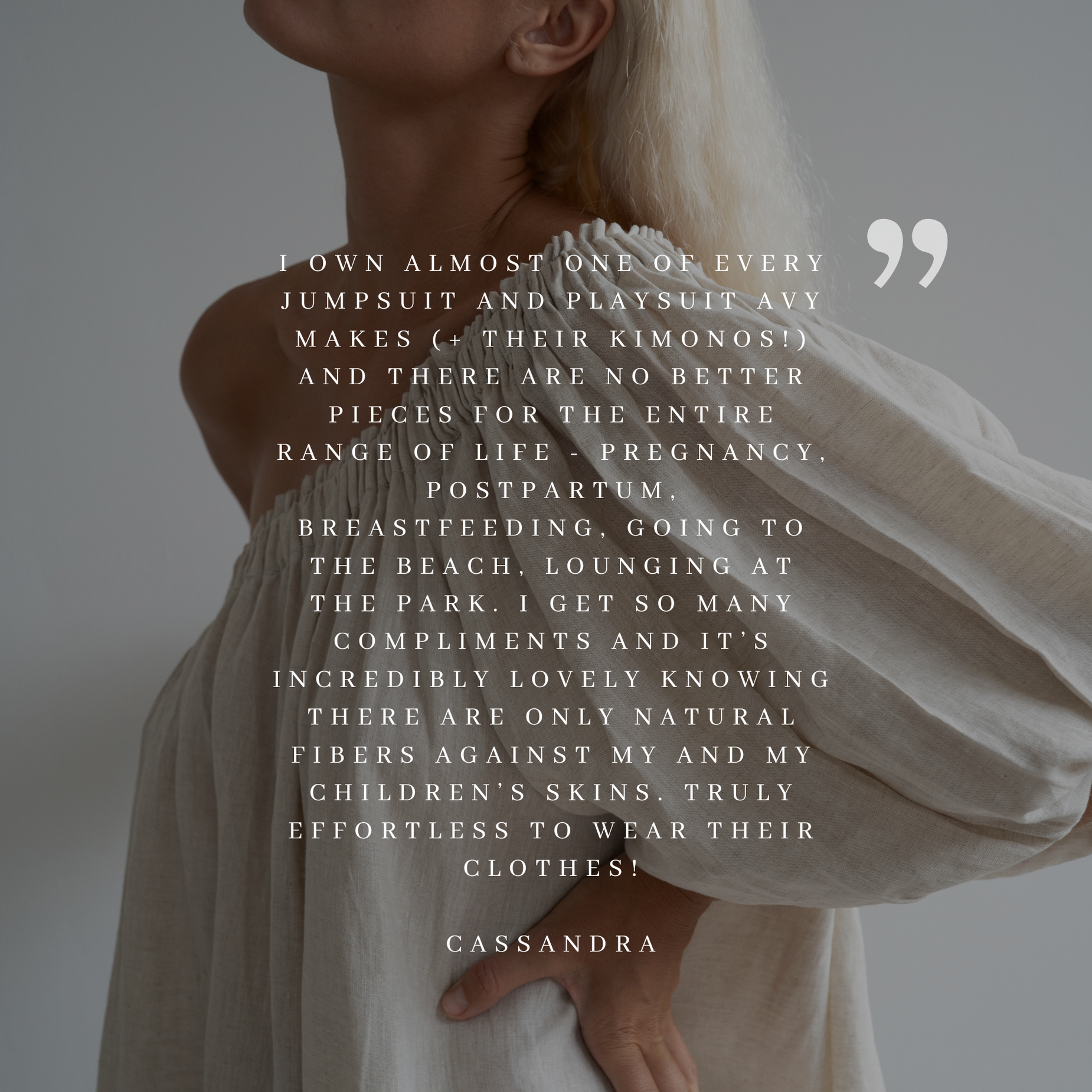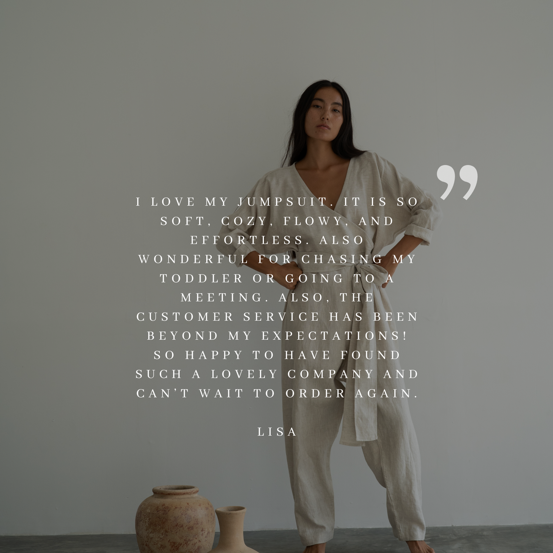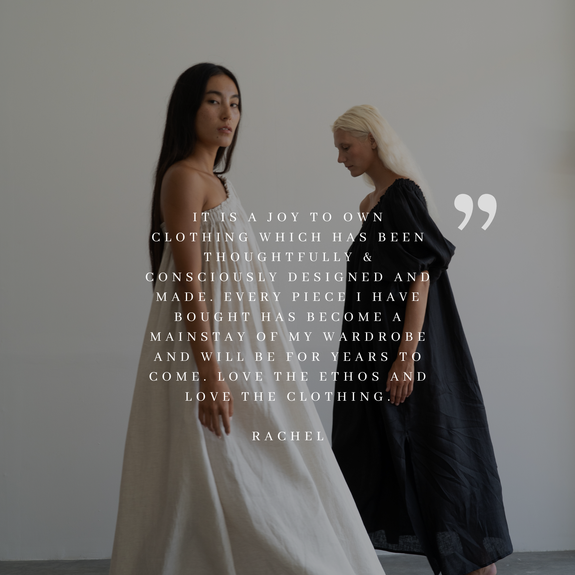 All of our garments are made with natural fibres, pure linens, hemp, silk, and soft cottons. They are designed for comfortable wearing, mostly one size and oversized. They are all French seamed, with a focus on quality and longevity.
