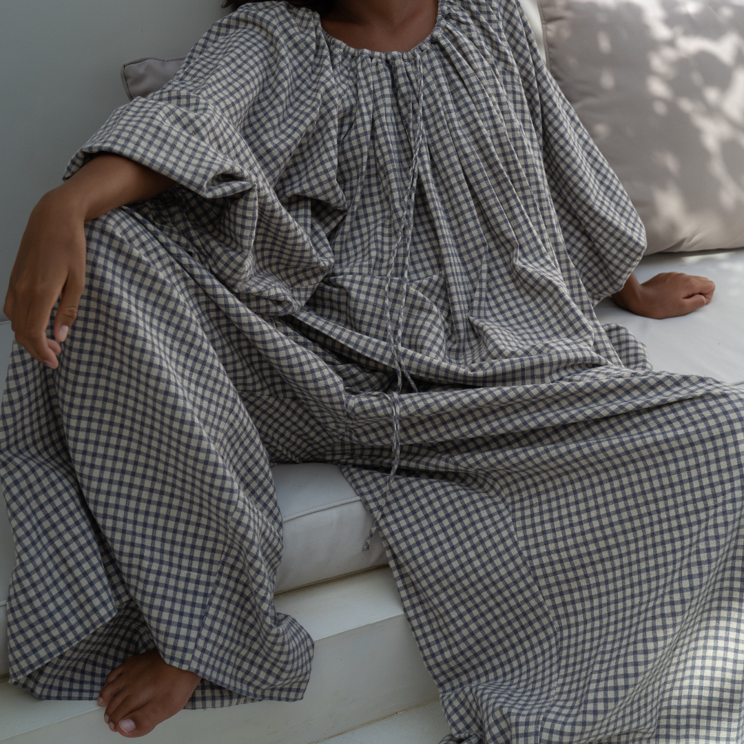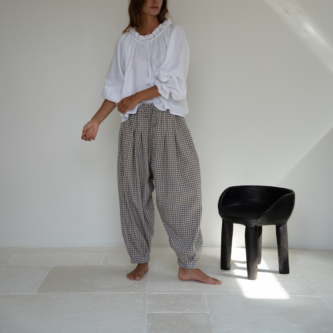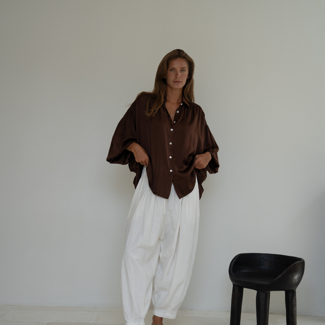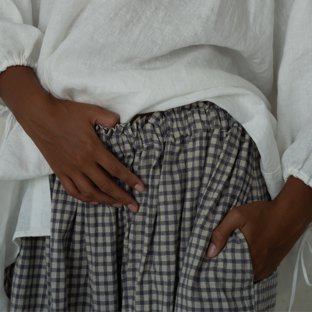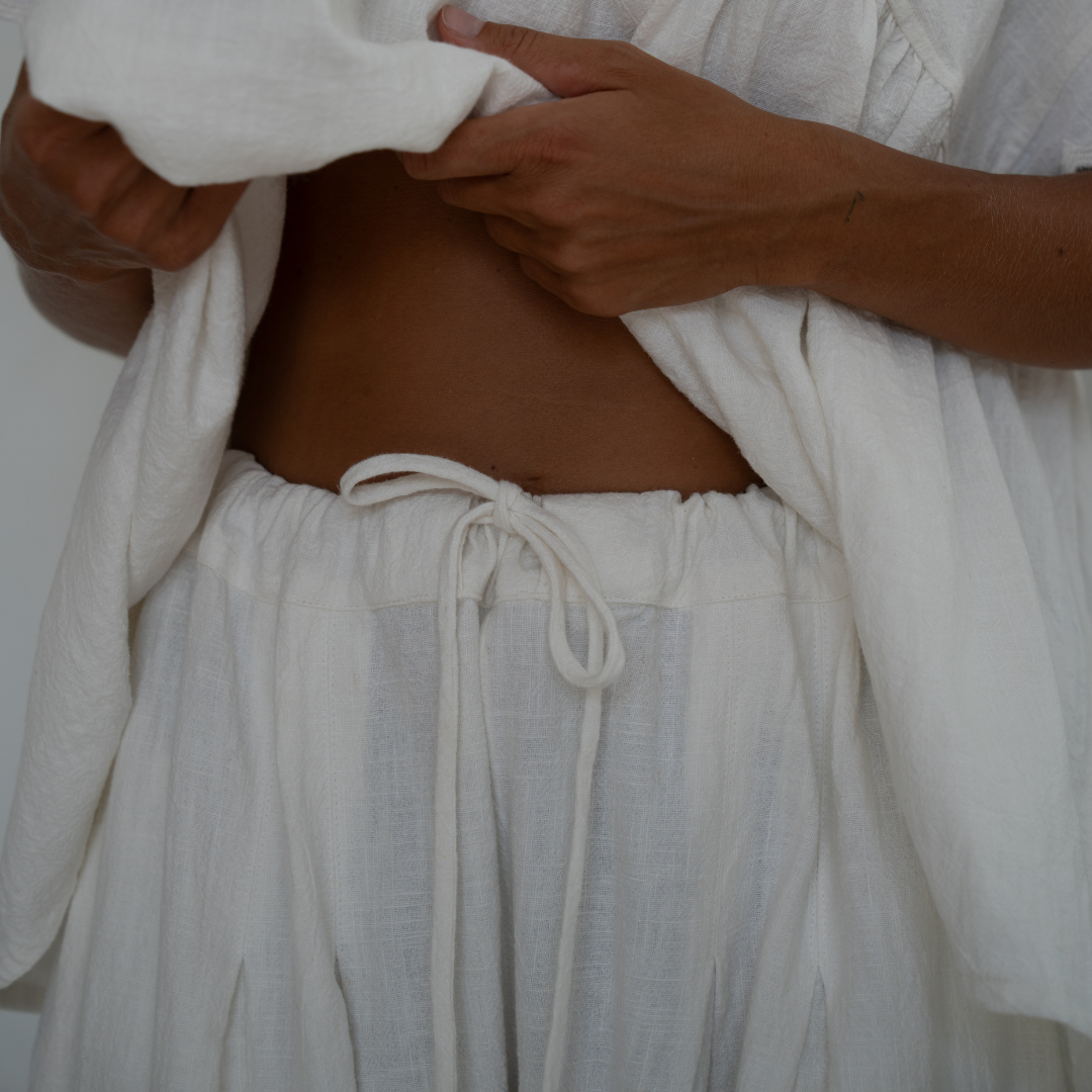 All of our garments are made with natural fibres, pure linens, hemp, silk, and soft cottons. They are designed for comfortable wearing, mostly one size and oversized. They are all French seamed, with a focus on quality and longevity.