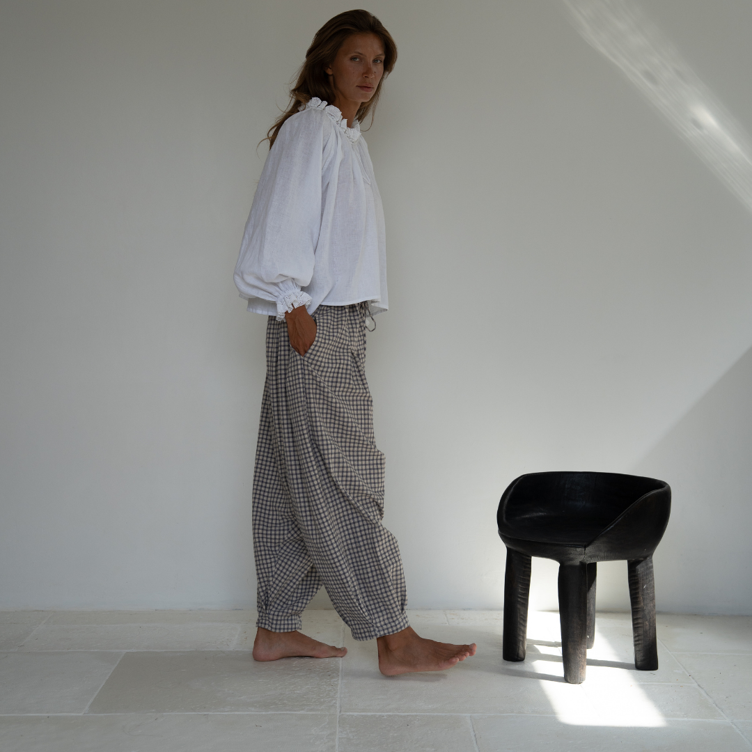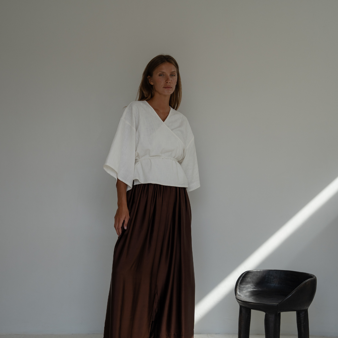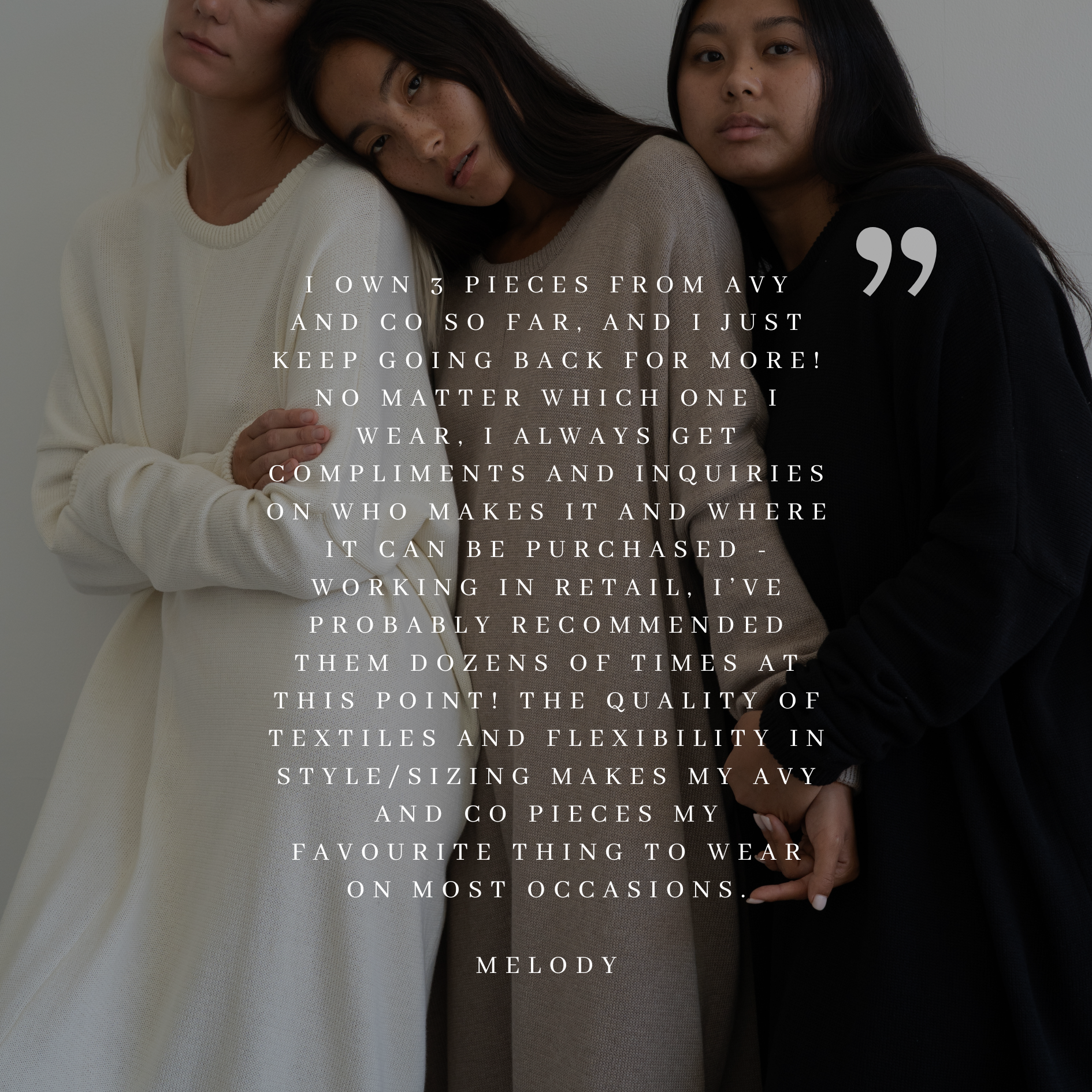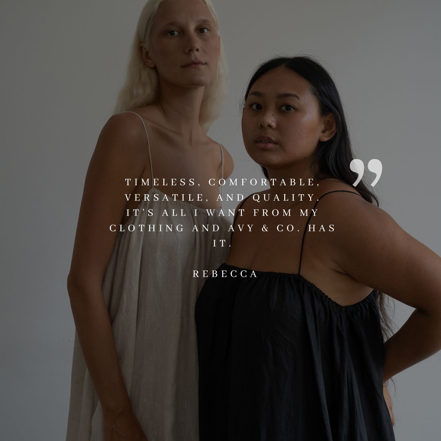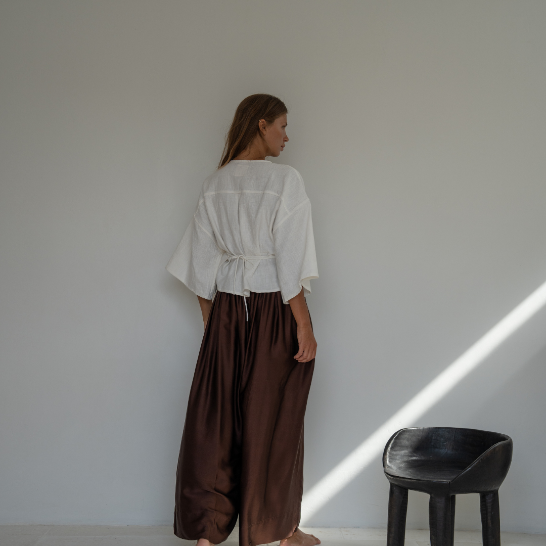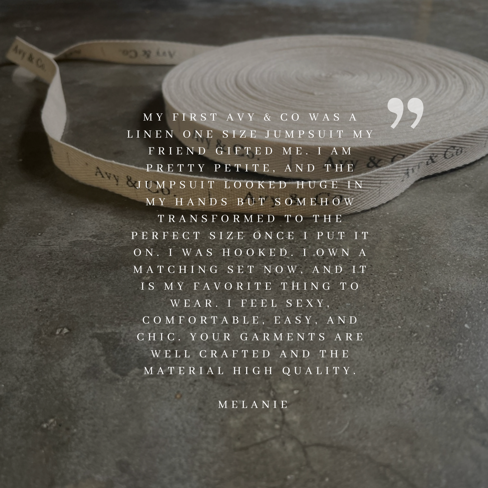 All of our garments are made with natural fibres, pure linens, hemp, silk, and soft cottons. They are designed for comfortable wearing, mostly one size and oversized. They are all French seamed, with a focus on quality and longevity.
