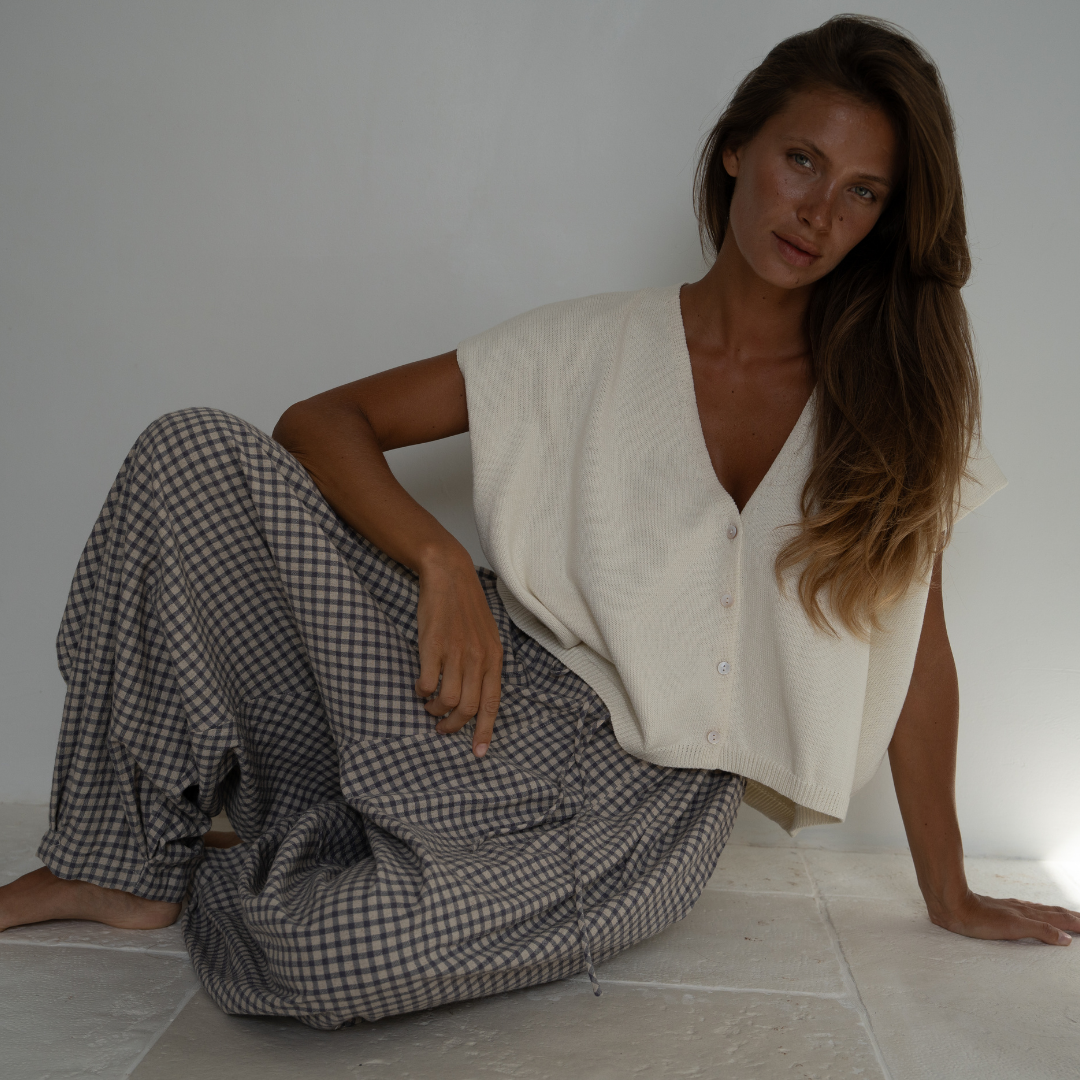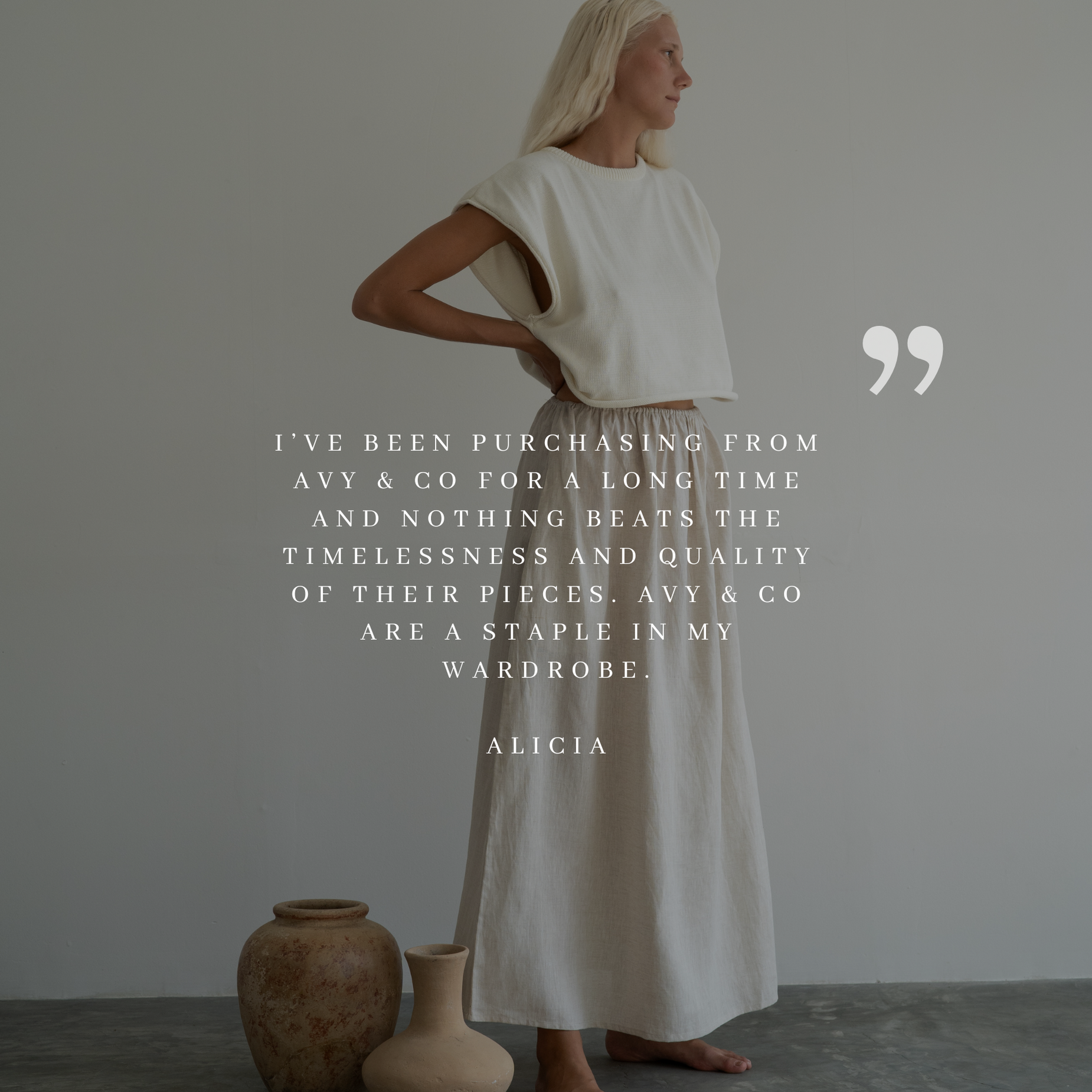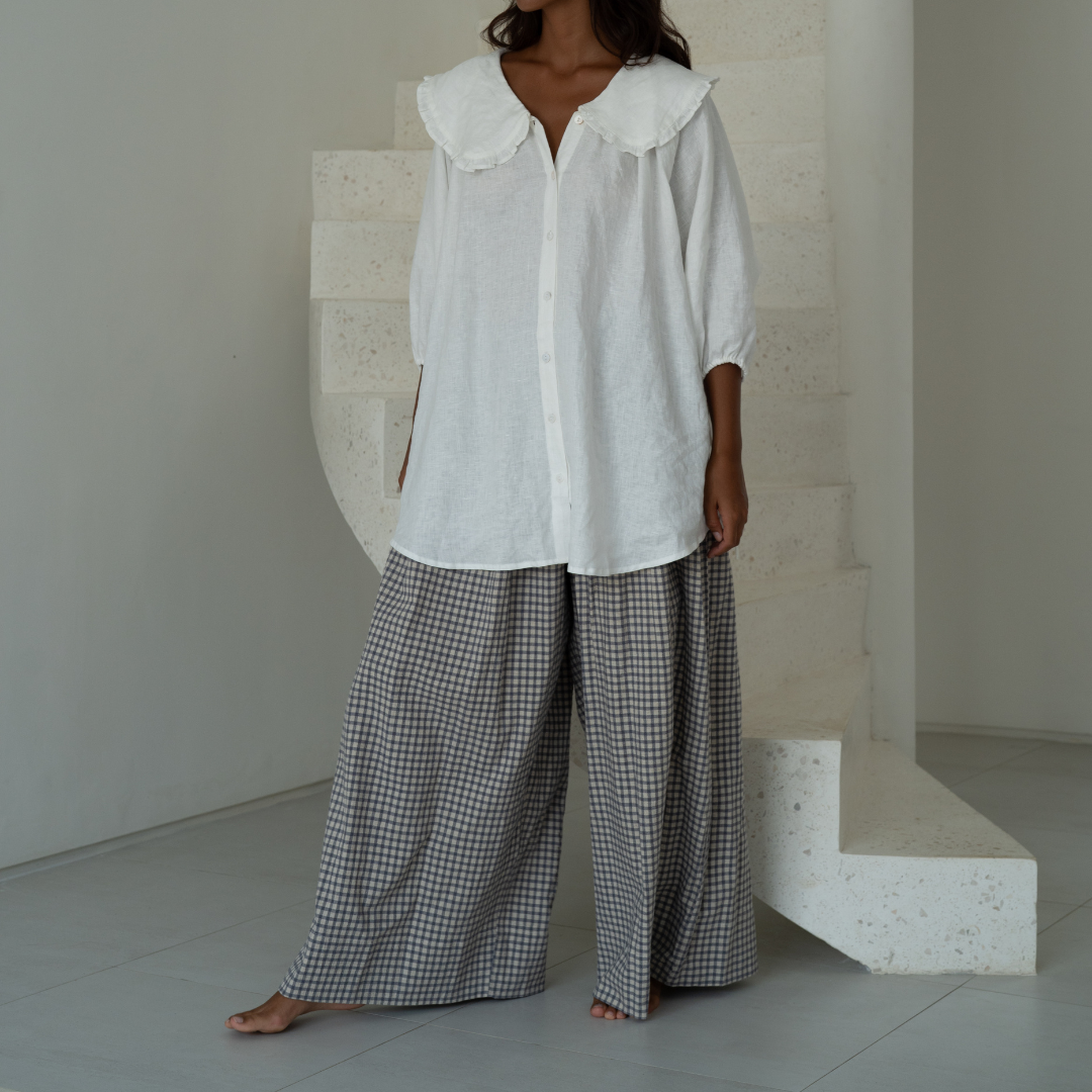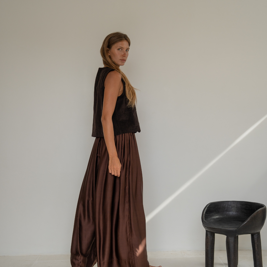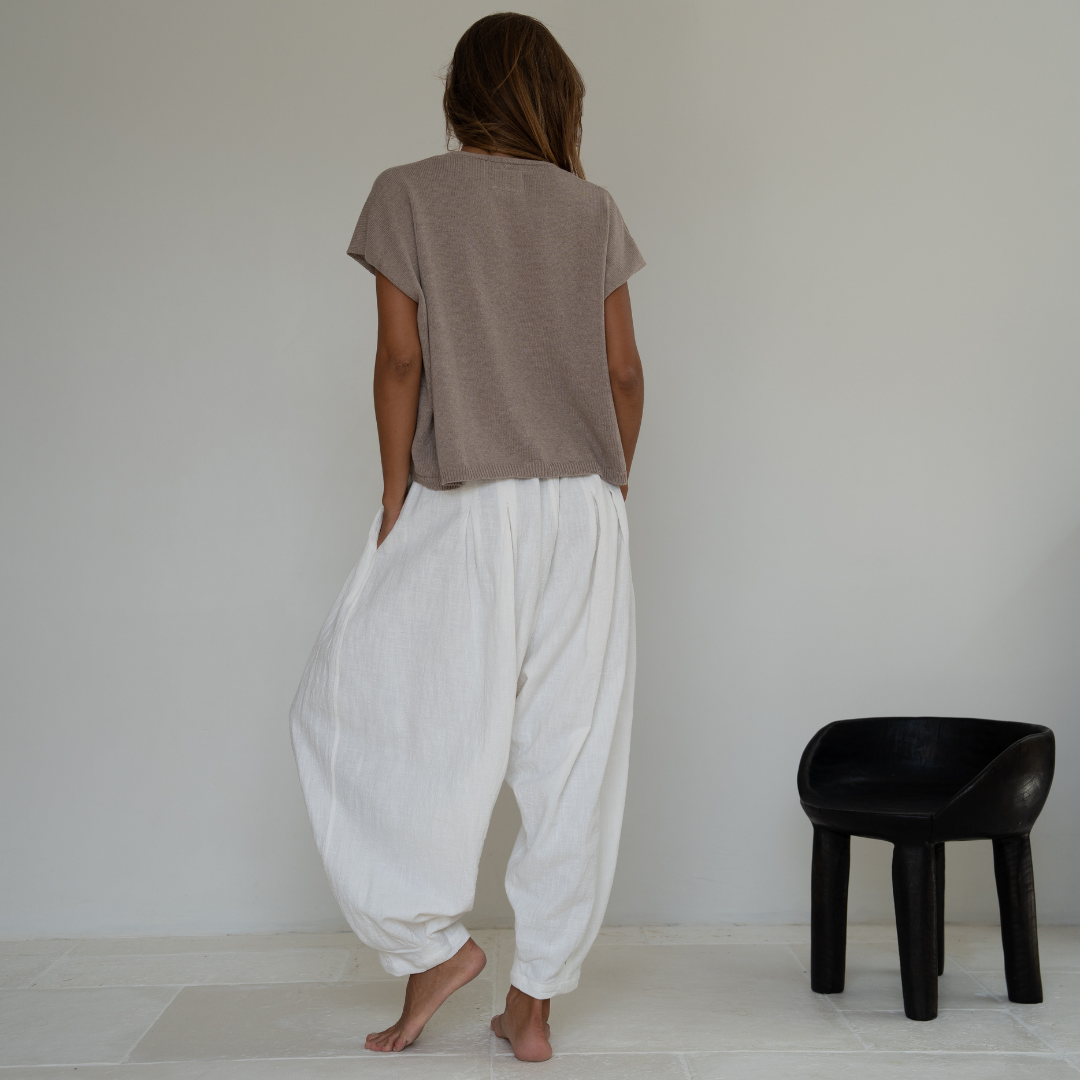 All of our garments are made with natural fibres, pure linens, hemp, silk, and soft cottons. They are designed for comfortable wearing, mostly one size and oversized. They are all French seamed, with a focus on quality and longevity.