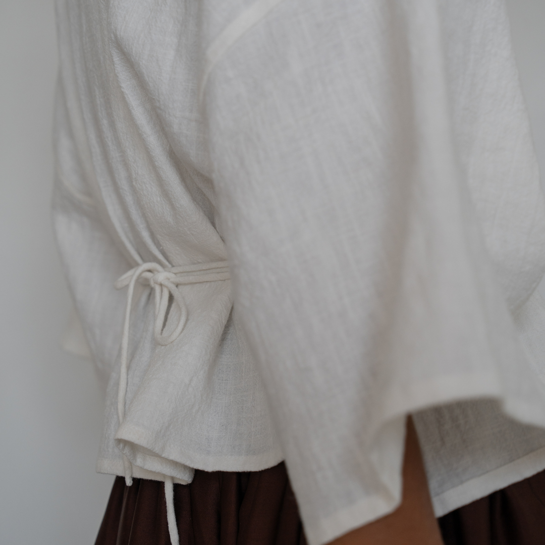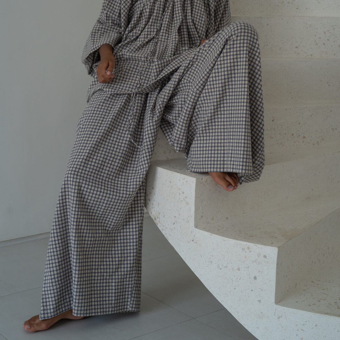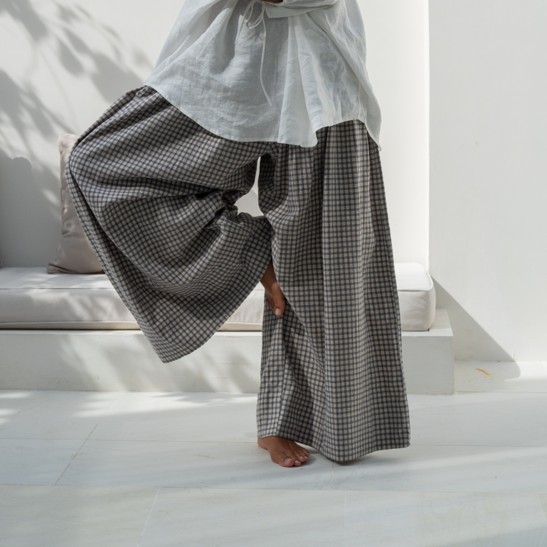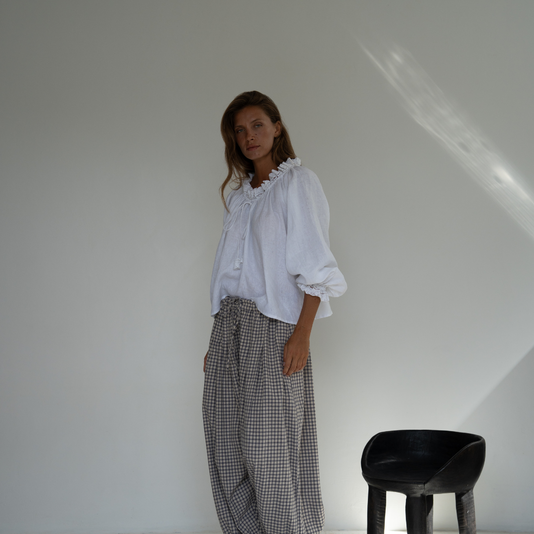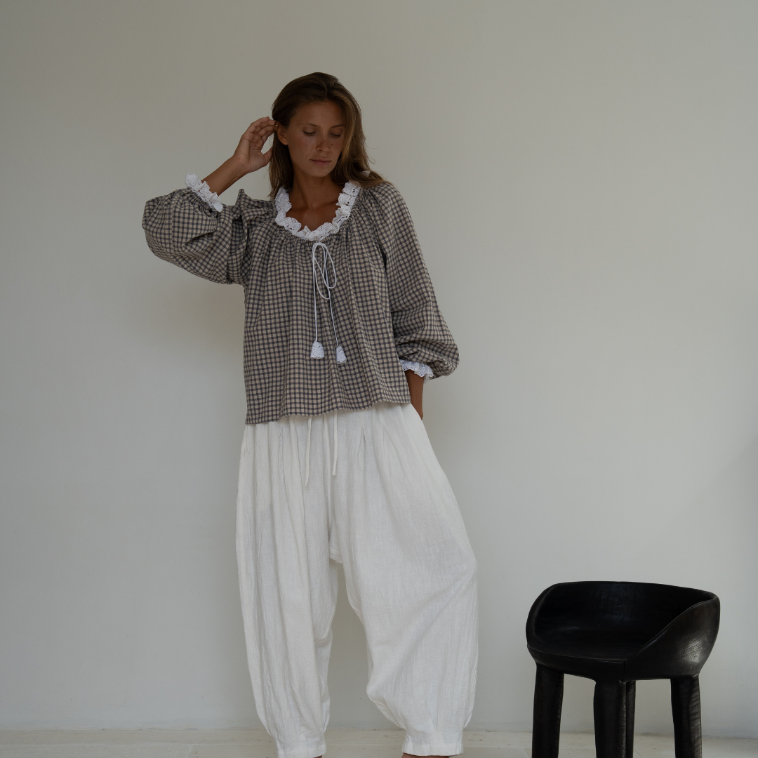 All of our garments are made with natural fibres, pure linens, hemp, silk, and soft cottons. They are designed for comfortable wearing, mostly one size and oversized. They are all French seamed, with a focus on quality and longevity.