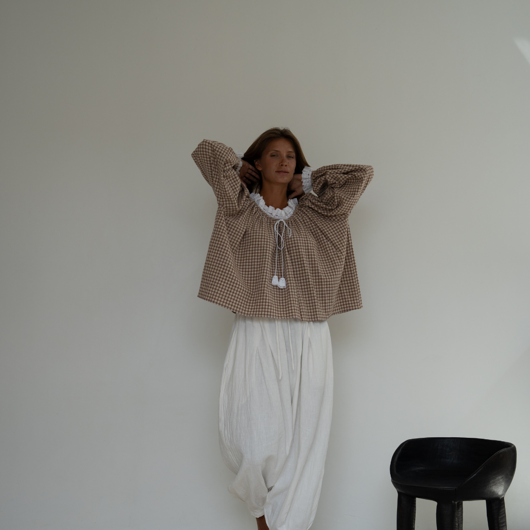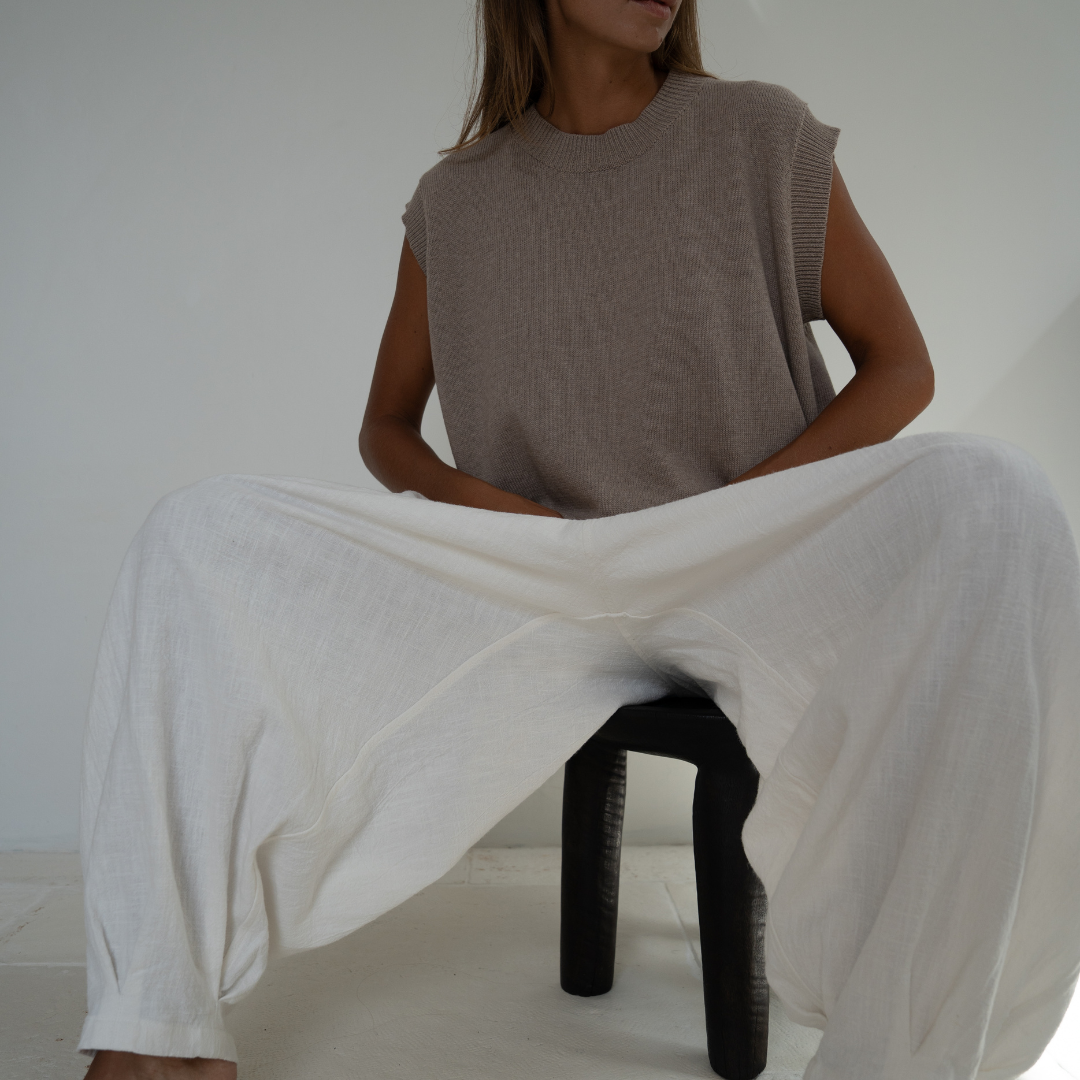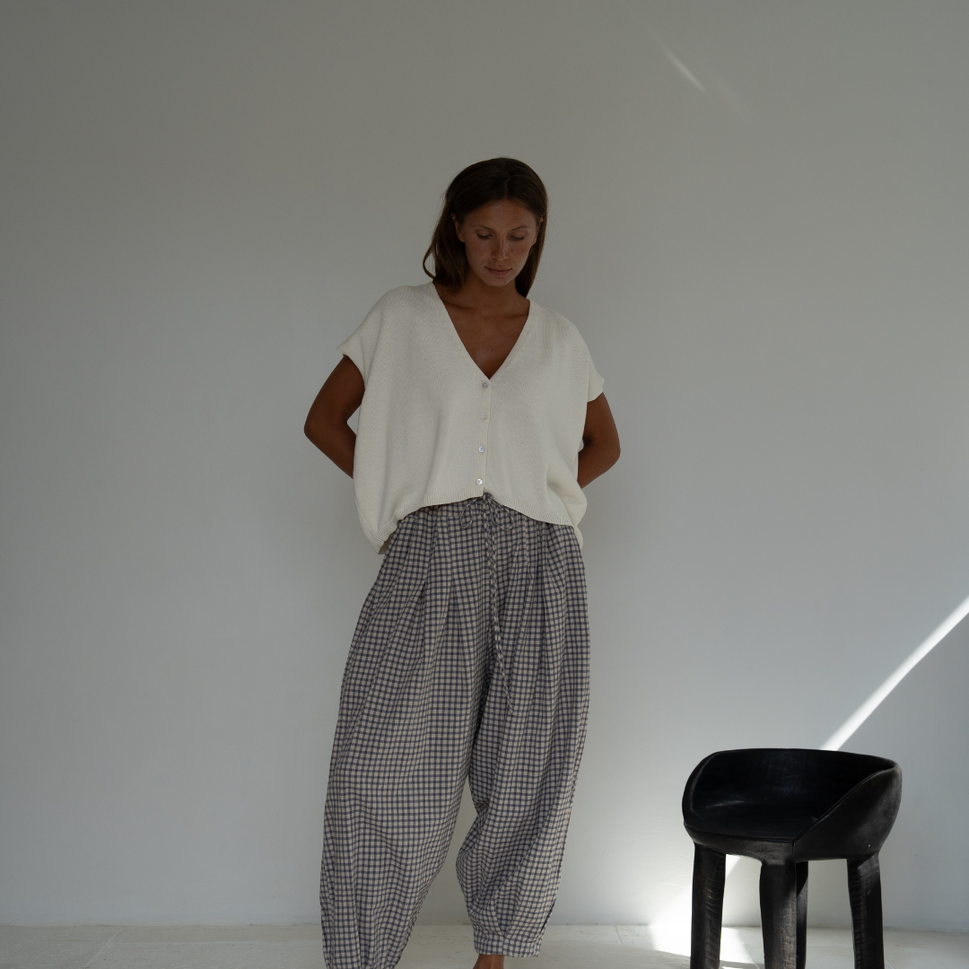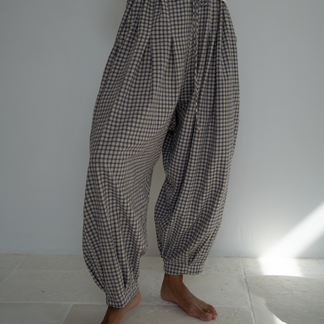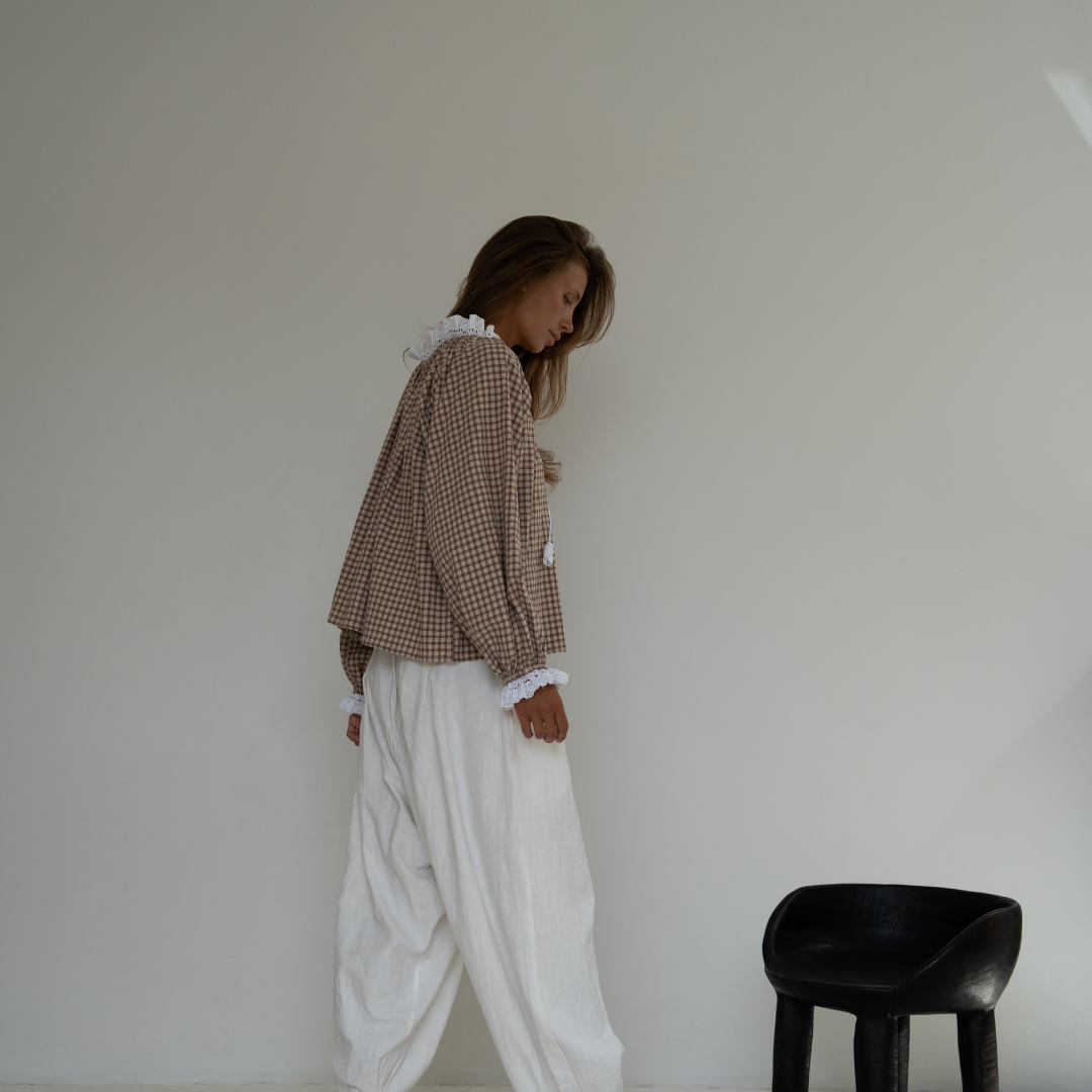 All of our garments are made with natural fibres, pure linens, hemp, silk, and soft cottons. They are designed for comfortable wearing, mostly one size and oversized. They are all French seamed, with a focus on quality and longevity.