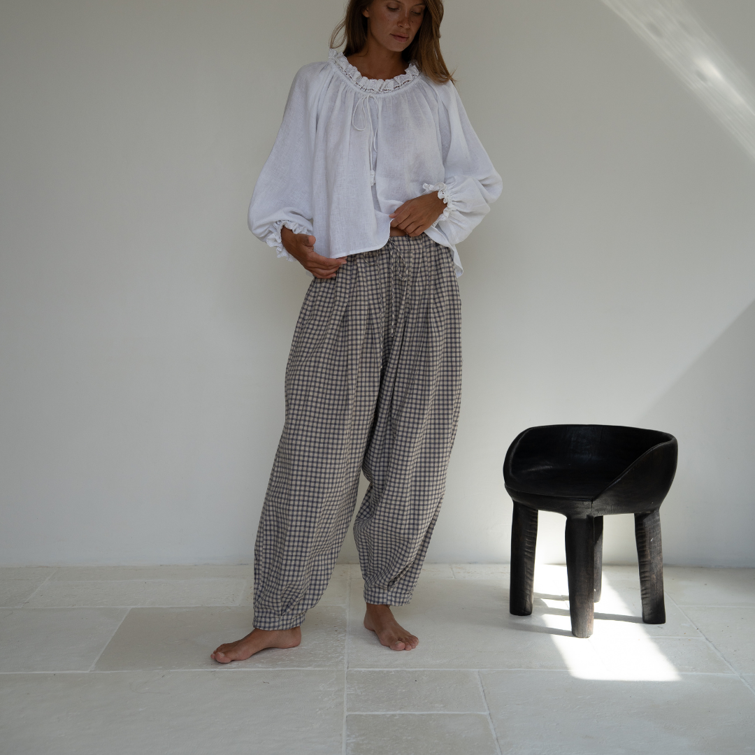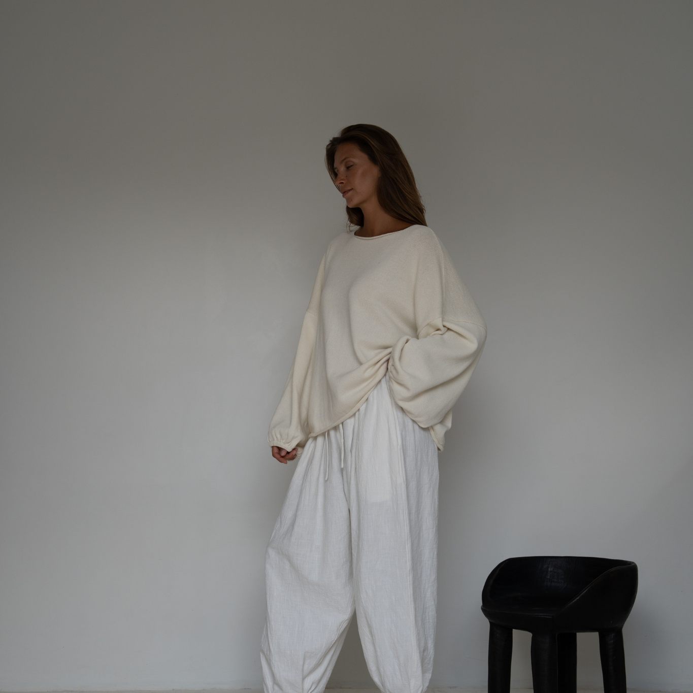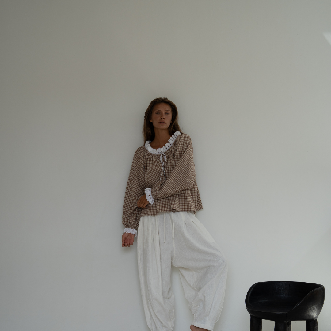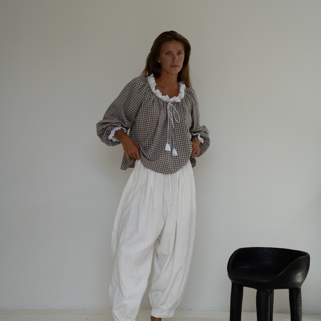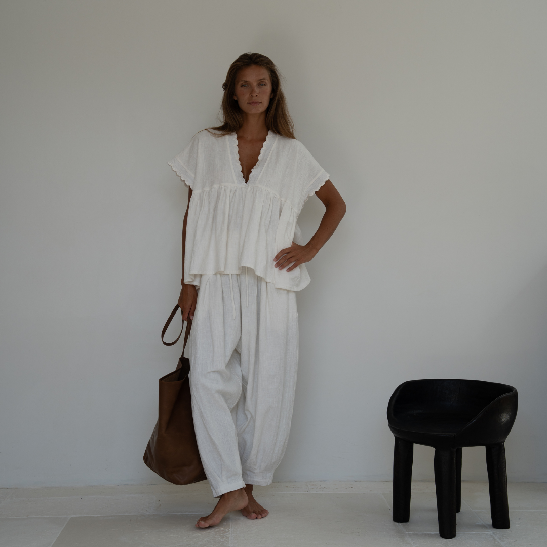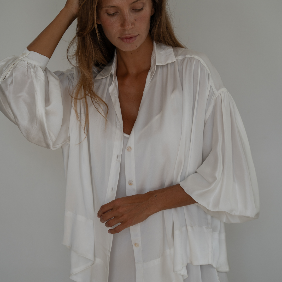 All of our garments are made with natural fibres, pure linens, hemp, silk, and soft cottons. They are designed for comfortable wearing, mostly one size and oversized. They are all French seamed, with a focus on quality and longevity.