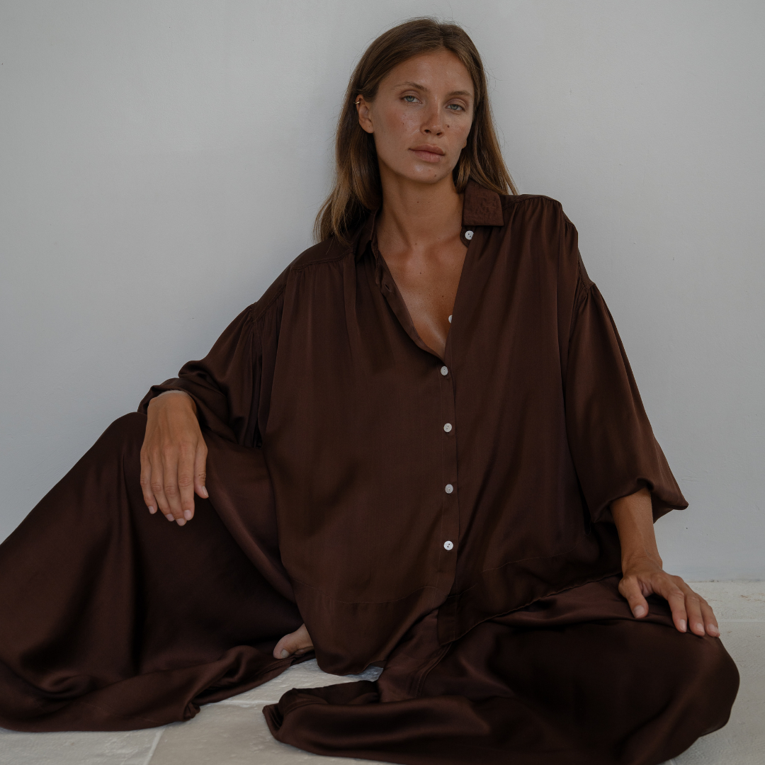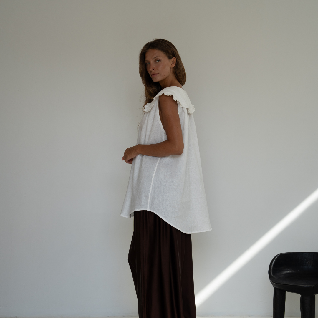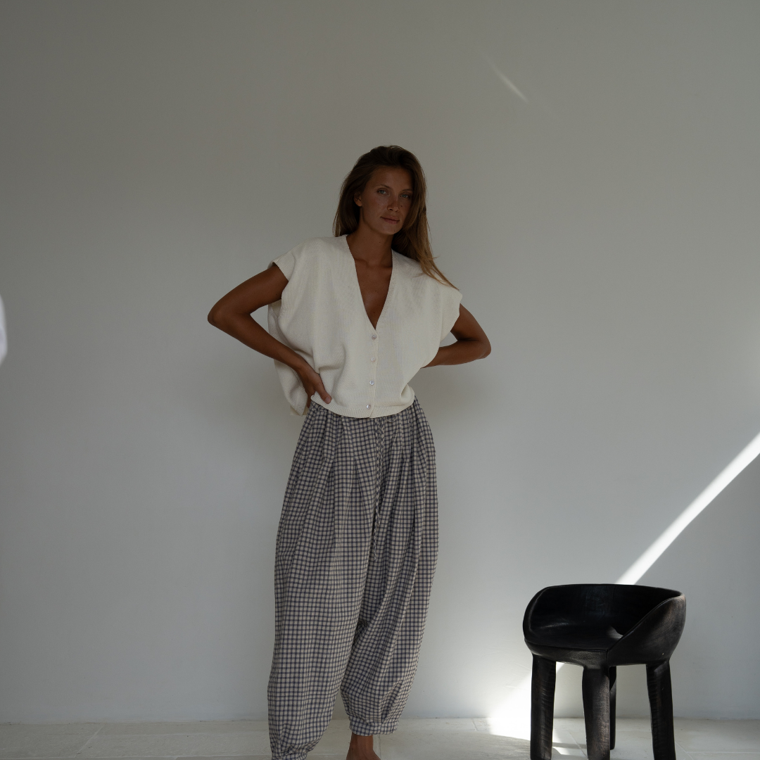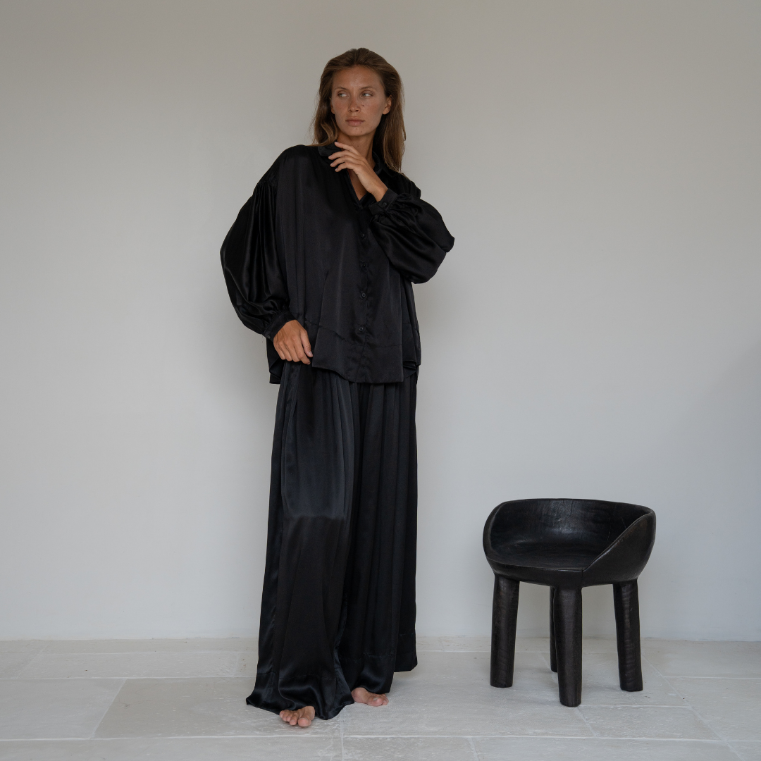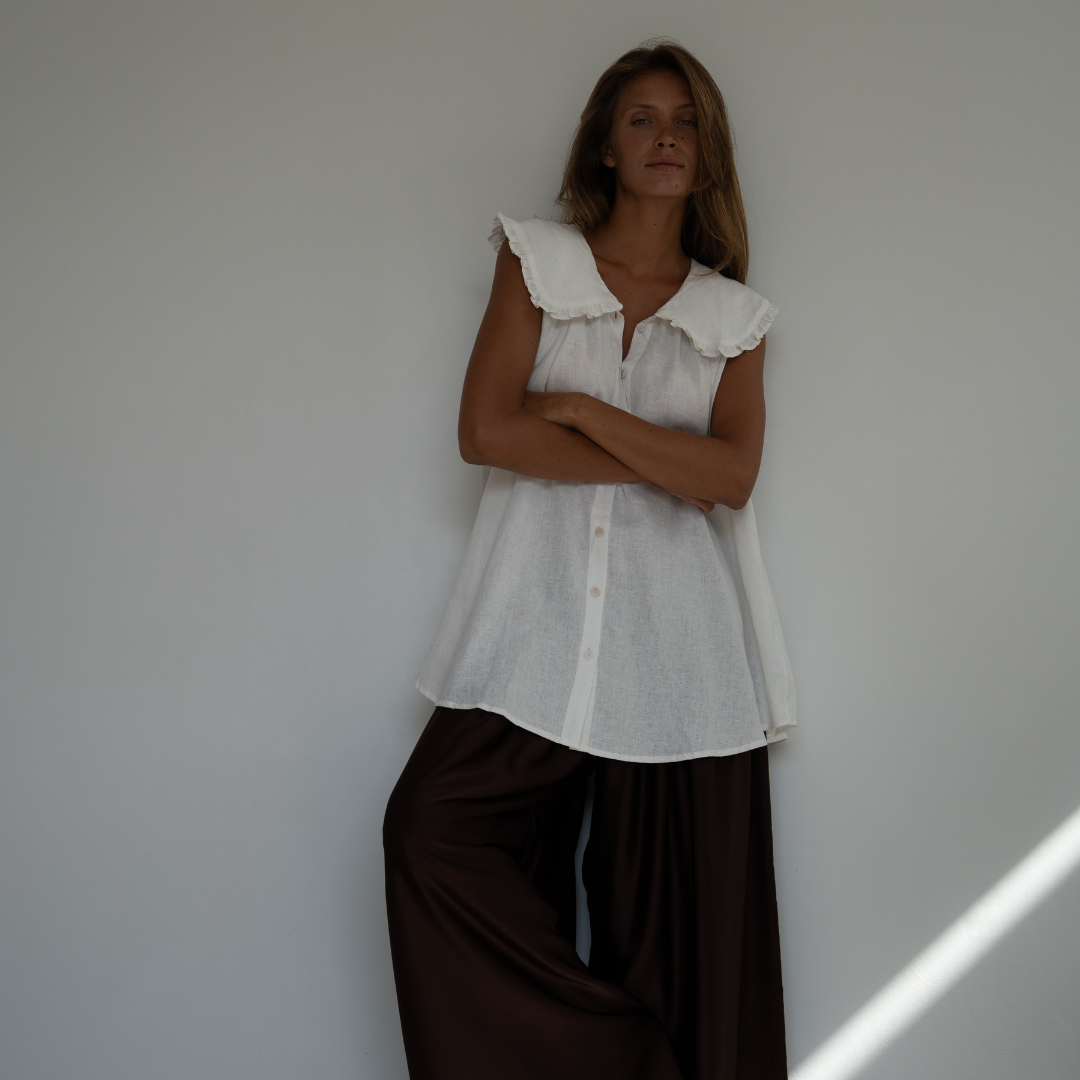 All of our garments are made with natural fibres, pure linens, hemp, silk, and soft cottons. They are designed for comfortable wearing, mostly one size and oversized. They are all French seamed, with a focus on quality and longevity.