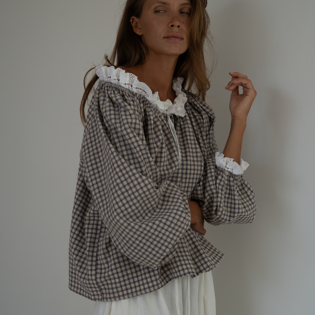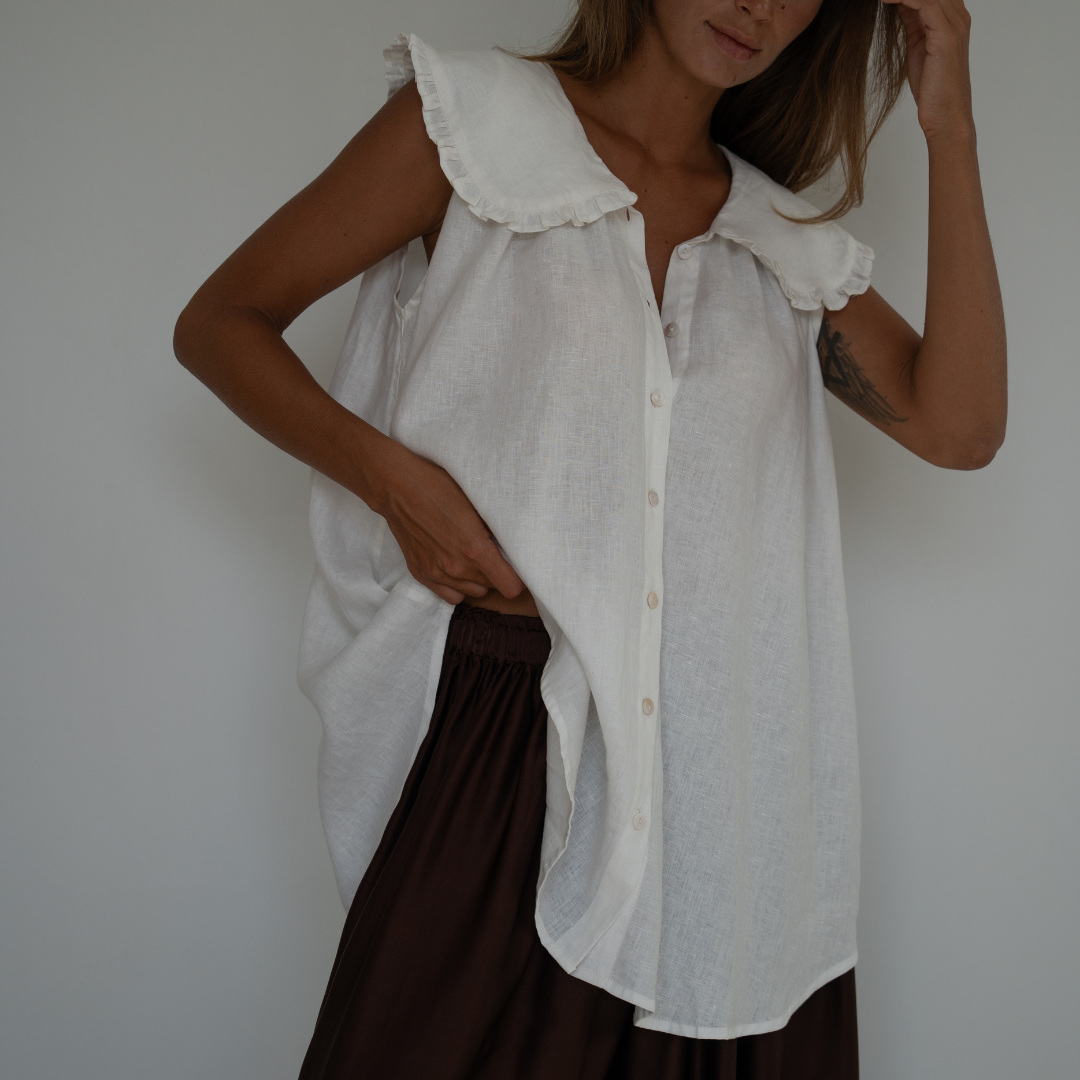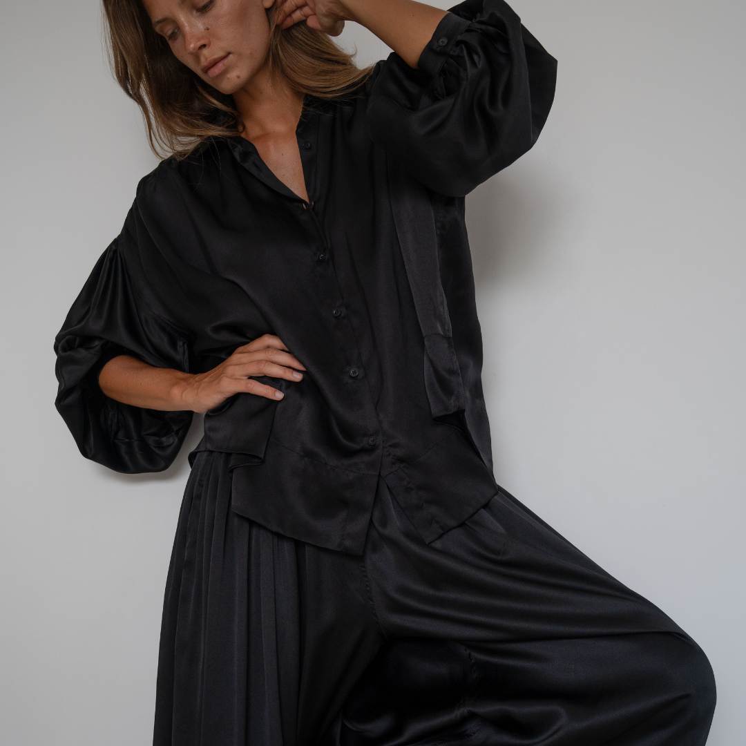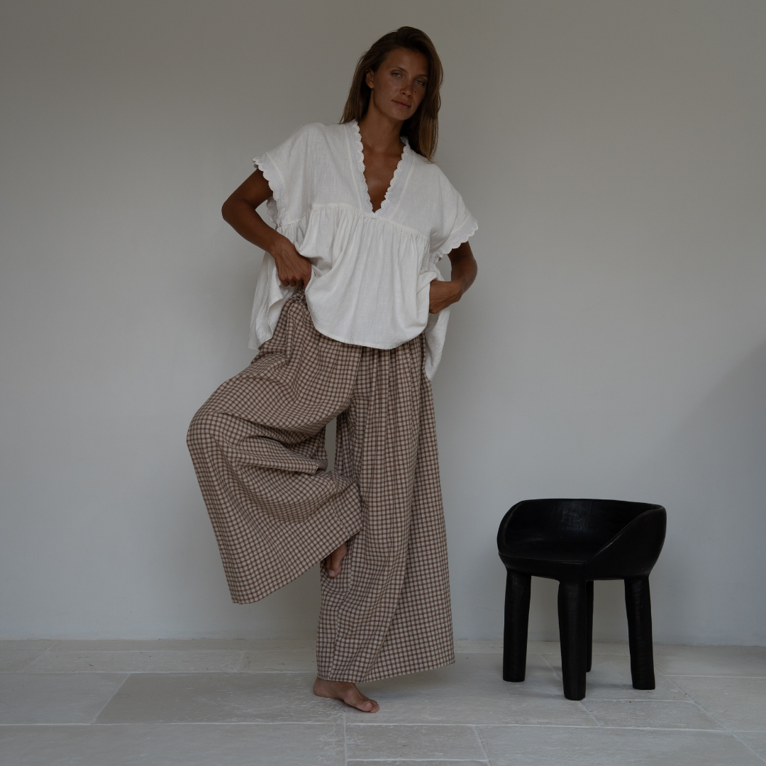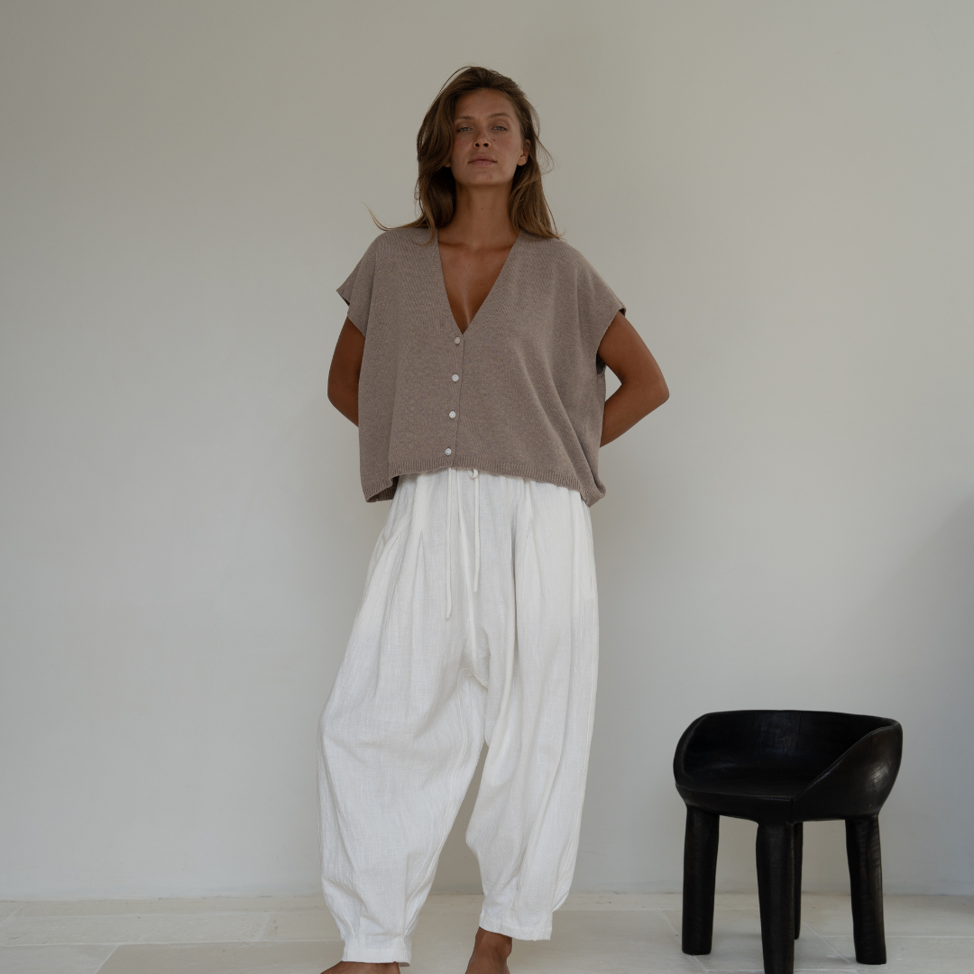 All of our garments are made with natural fibres, pure linens, hemp, silk, and soft cottons. They are designed for comfortable wearing, mostly one size and oversized. They are all French seamed, with a focus on quality and longevity.