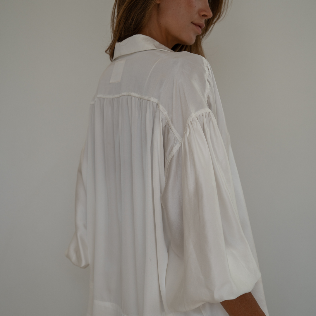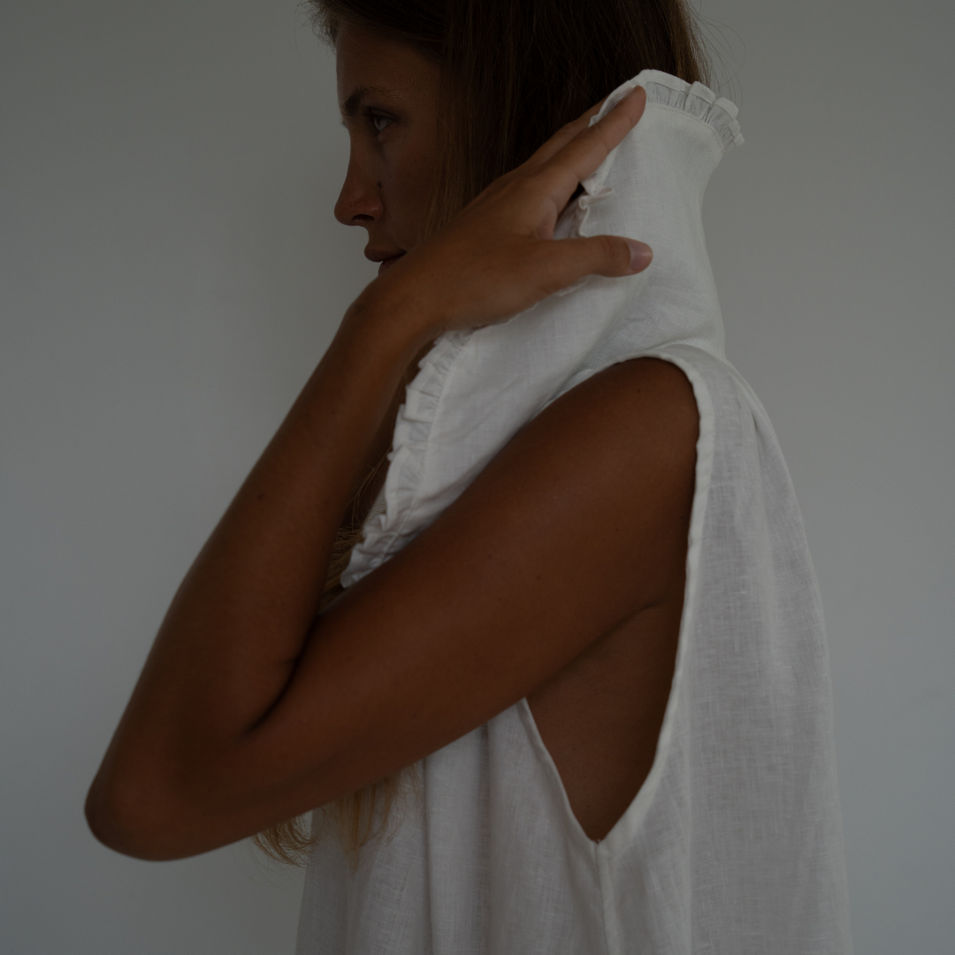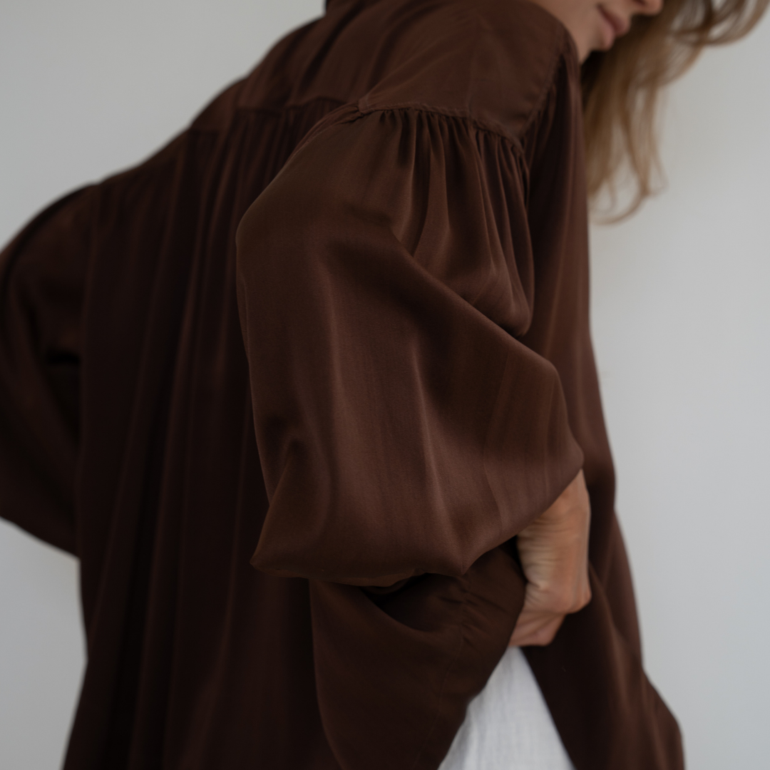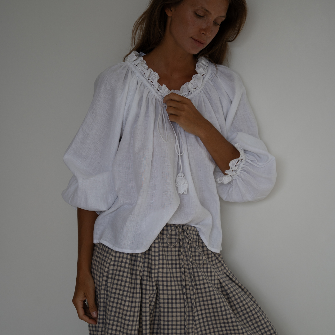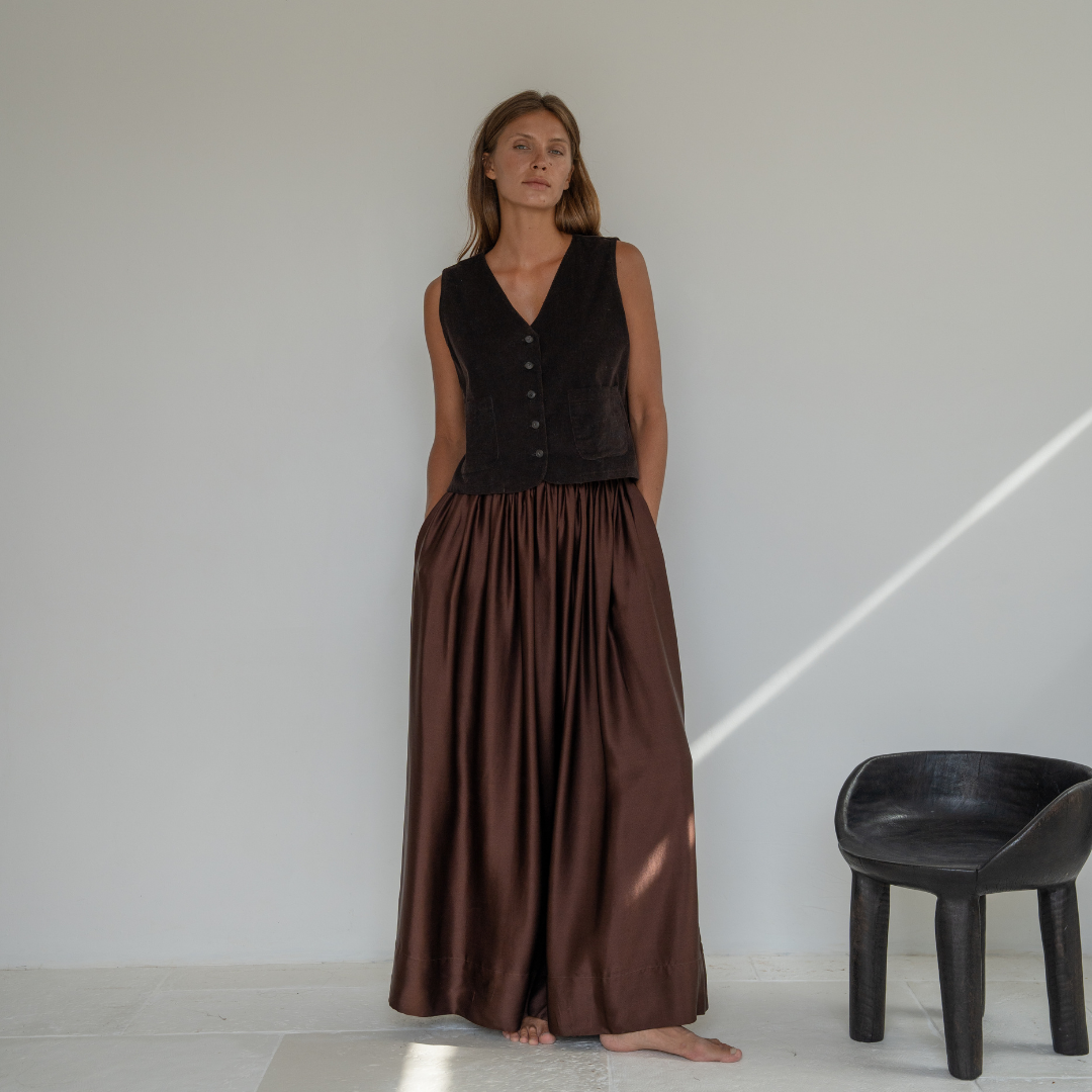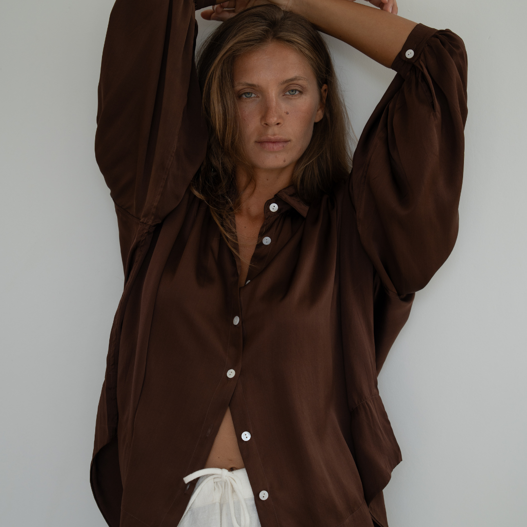 All of our garments are made with natural fibres, pure linens, hemp, silk, and soft cottons. They are designed for comfortable wearing, mostly one size and oversized. They are all French seamed, with a focus on quality and longevity.