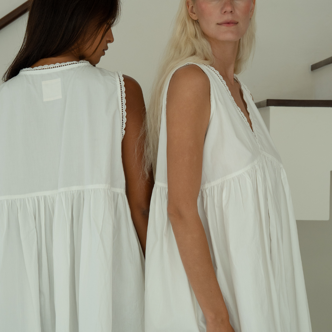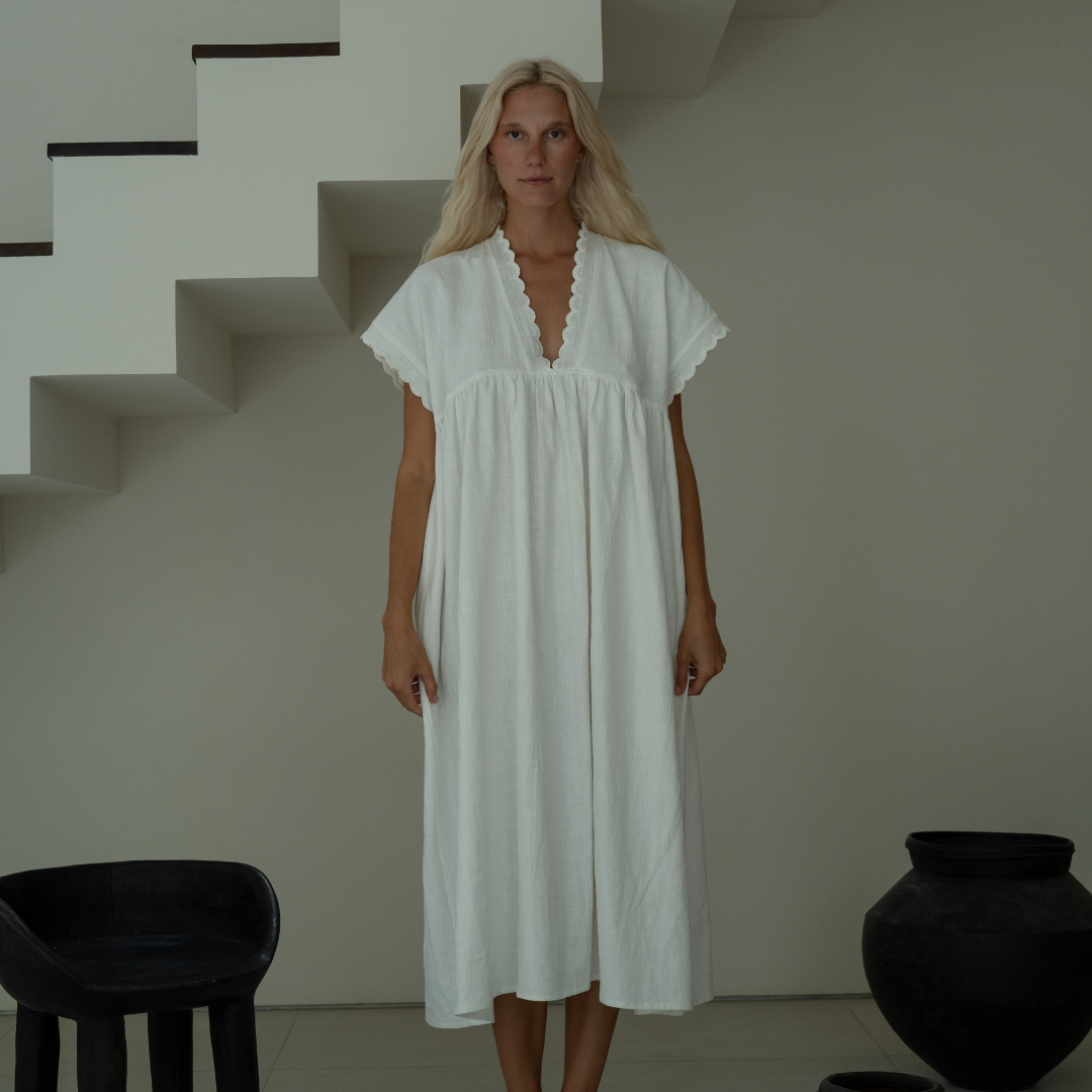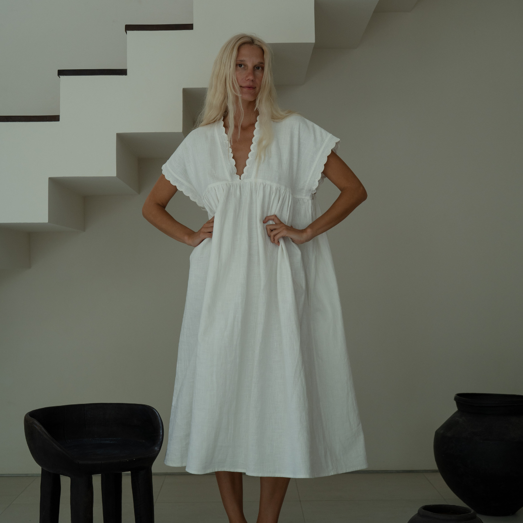 All of our garments are made with natural fibres, pure linens, hemp, silk, and soft cottons. They are designed for comfortable wearing, mostly one size and oversized. They are all French seamed, with a focus on quality and longevity.