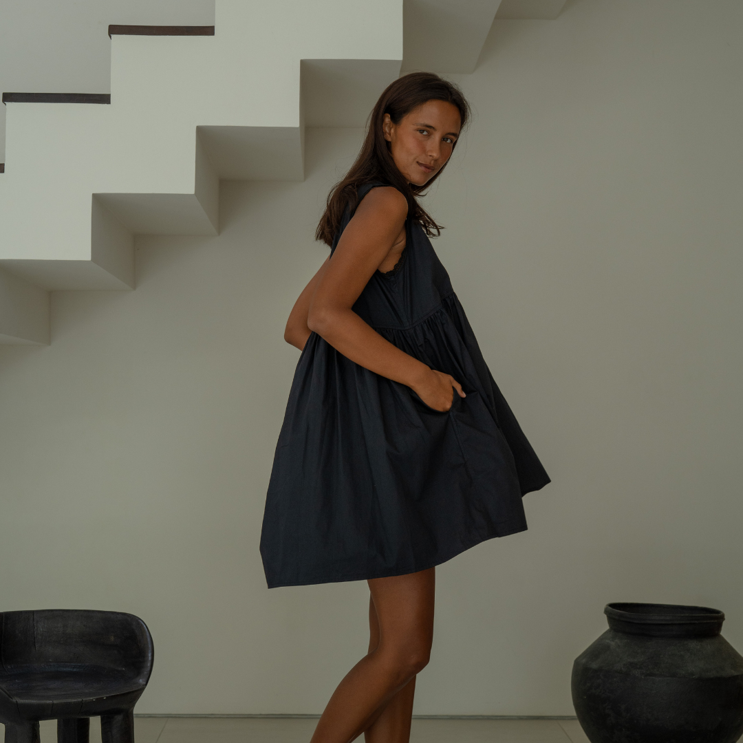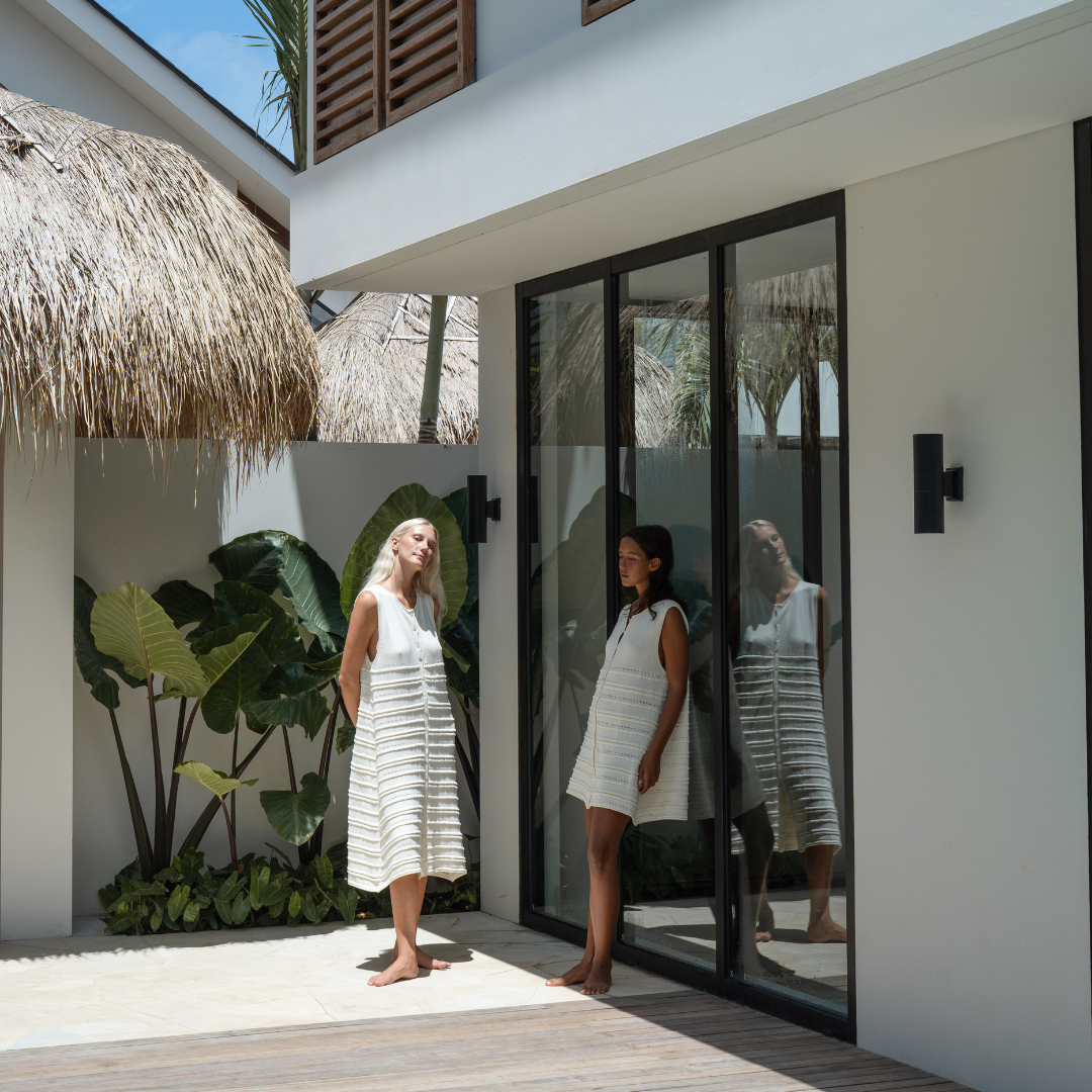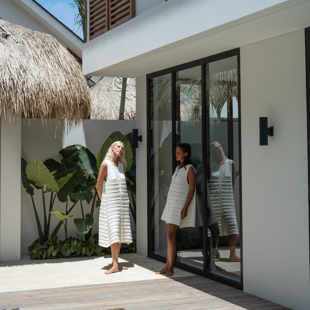 All of our garments are sewn by our small team of 5 tailors in Bali, Indonesia. All of our parcels arrive with a complimentary drawstring bag, and scrunchies, made from our fabric off-cuts making our production process waste free.